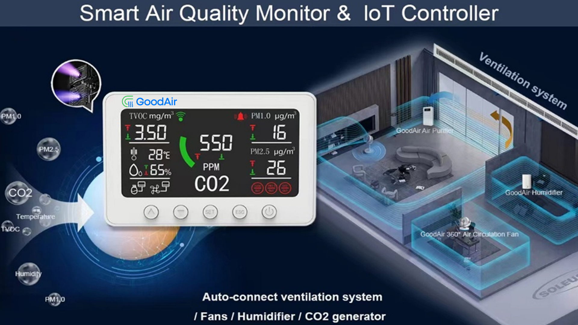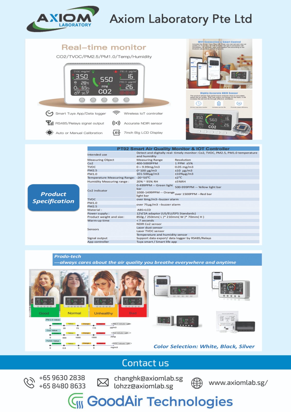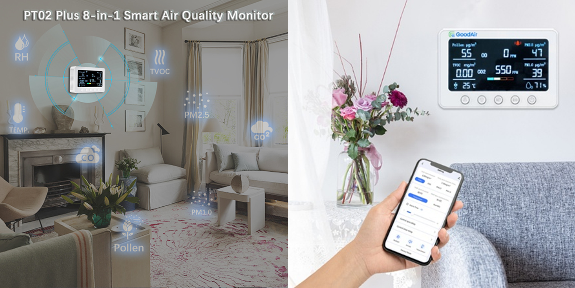GoodAir’s PT02 Smart Air Monitor delivers precision air quality monitoring with advanced CO₂, temperature, and humidity sensing for accurate, real-time insights. Designed for homes, offices, and agricultural environments, it offers wide measurement ranges, reliable performance, and seamless adaptability to diverse conditions. With smart alerts, user-friendly operation, and consistent accuracy, PT02 ensures healthier indoor spaces, improved productivity, and optimized environmental control you can trust.